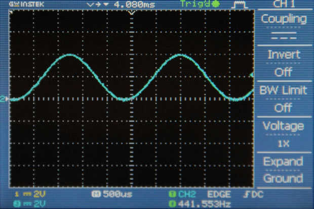 El código siguiente salidas una onda sinusoidal utilizando la misma interrupción establecido anteriormente. Arduino ha construido en función del seno, pero es demasiado lento para ejecutar a 44,1 kHz, por lo que almacena un conjunto de valores del seno para tirar de durante cada interrupción. Corrí un simple script en Python (abajo) para generar 100 valores de 127+127*sin(2*3.14*t/100):