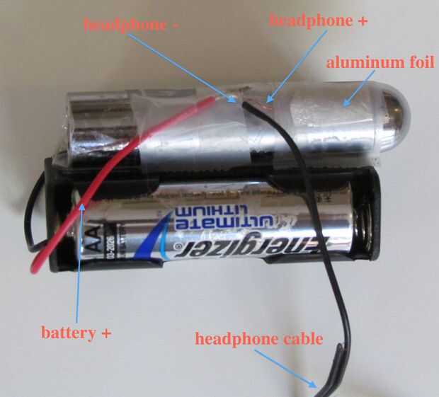 El cable negativo (cobre) se consigue soldado al cable positivo desde el portapila, y conseguir unirá el cable positivo (rojo o azul) a la carcasa del indicador. Desafortunadamente, mi puntero láser es entubado en aluminio, y no sé cómo soldar aluminio. Así, en lugar de soldadura, usé papel de aluminio. Envuelva un trozo de papel de aluminio alrededor del cable y presione firmemente. Luego colocar esa hoja plana contra el cuerpo de láser y cinta en.