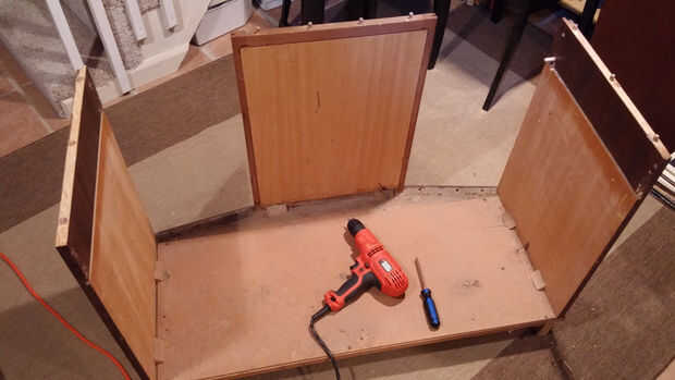 Matierials necesitada:~ Dos 5 x 31 3/4 en piezas de madera contrachapada~ Tres piezas de 25x6in de madera contrachapada~ Una pieza de 15x25in de madera contrachapada~ Dos piezas de 5x15in de madera contrachapada~ Una pieza de 25x5in de madera contrac