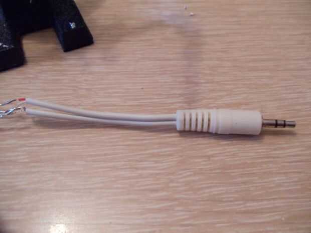 El puerto de audio macho fue rescatado de un roto par de altavoces que he encontrado en una descarga electrónica. En la mayoría de los casos encontrarás un cable blanco, rojo y negro dentro de la envoltura de cable más grande. Rojo suele ser el canal derecho y blanco suele ser el canal izquierdo, negro suele ser el suelo. En el puerto de cable que utiliza, rojo estaba en lo cierto, fue blanco y gris se quedó.
