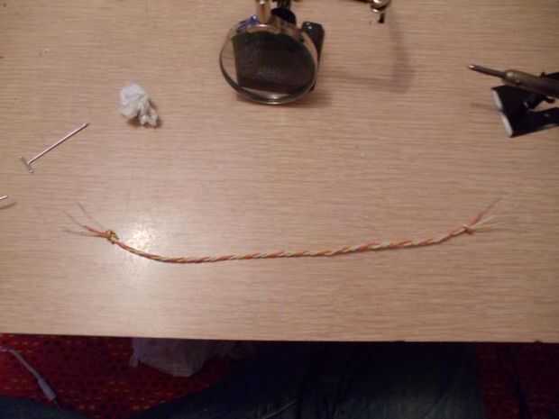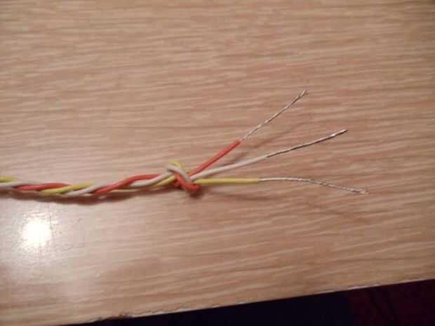 Fue emparejado por alineando los extremos de tres longitudes de alambre, poner en ejercicio y que alguien use el taladro mientras mantiene el otro extremo de los cables. El nudo es para que los cables no desentrañar.