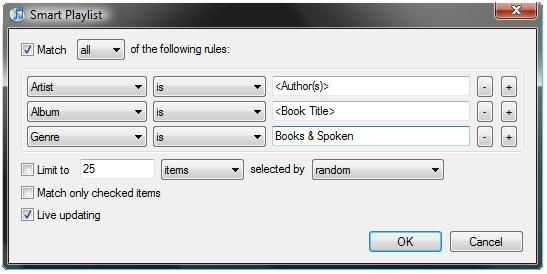 Esto tendrá el audiolibro se muestran como múltiples artículos en el menú de tu iPod "Audiolibro". Para que sea un poco más fácil de conseguir, te recomiendo establecer una lista de reproducción inteligente.