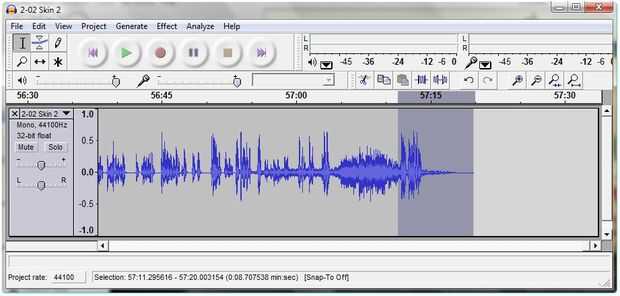 Después de un corto tiempo, usted debe ver alcance el archivo de audio en la sección principal de la pantalla de Audacity. Todo lo que tienes que hacer es resaltar la sección corta en el extremo que contiene el mensaje "Inserte el siguiente disco". JUGAR EL ESLOGAN SELECCIONADO PARA ASEGURARSE DE QUE USTED NO QUITAR ALGUNO DE LA HISTORIA! Una vez que estés satisfecho con la selección, pulse la tecla "Suprimir" en su teclado.