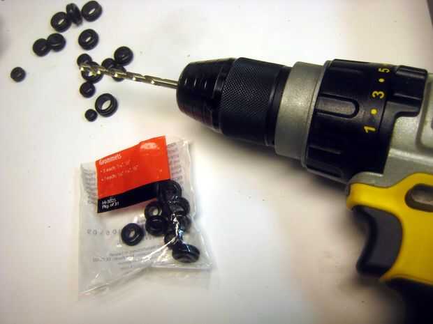 Para perforar el plástico de los auriculares taladre un orificio guía muy pequeño donde desea que el orificio de tamaño completo y luego perfore un agujero de tamaño completo. Utilice una broca del tamaño de los residuos de los ojales más pequeño en la bolsa de shack de radio. (Creo que sobre una broca #12)