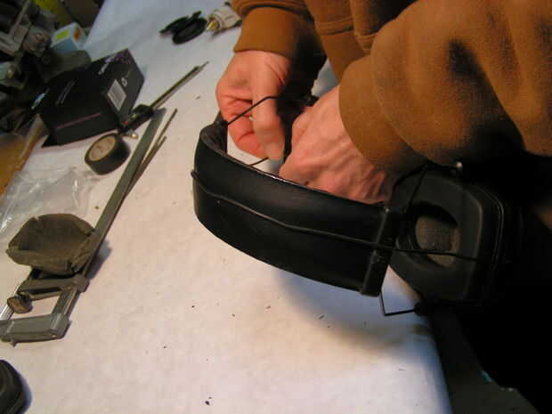 Coloque el cable sobre la diadema y ajuste la diadema y orejeras para que el cable es relativamente tenso.  Estirar un trozo de cinta aislante sobre la banda, asegurando el cable a la banda.  Recortar la cinta sobrante con unas tijeras y alise la cinta en su lugar.