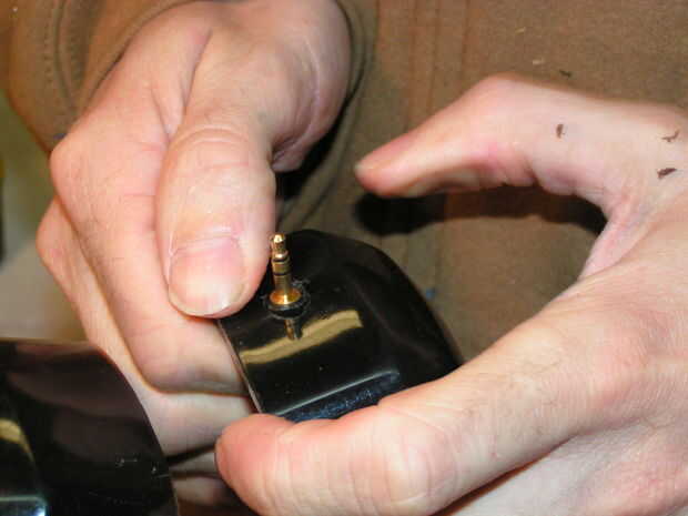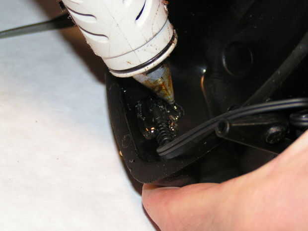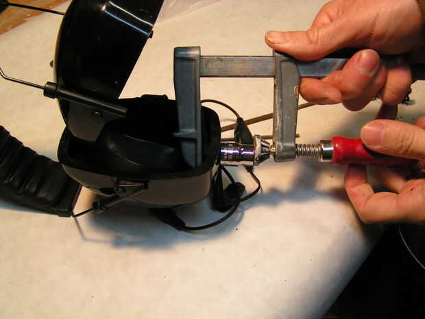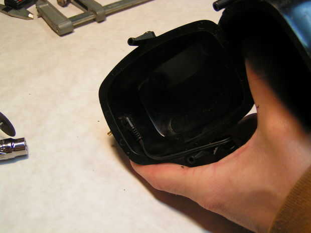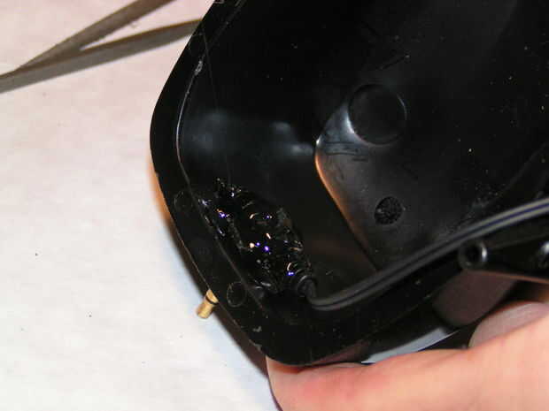 Presione la clavija del conector en el agujero desde el interior de la cáscara de la orejera.  Puede utilizar una pinza pequeña y una toma para presionarlo en si es un ajuste de ajuste.  Una vez en el lugar, caliente derrite el pegamento el cable desde el interior.