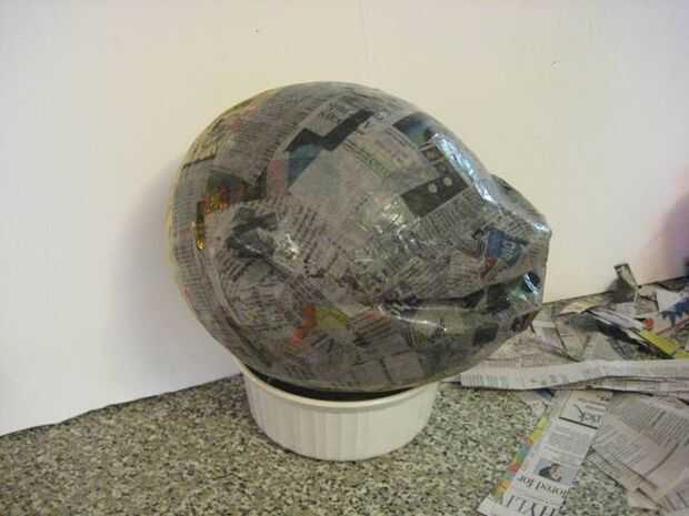 Cubrir esta parte con más tiras de papel maché y dejar secar.  Después de que se seque puede volver y "relleno" en las partes con más tiras o rollos de periódico, papel maché sobre las piezas añadidas en.
