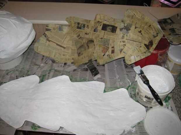 Pintar todo con una capa de pintura blanca. Tengo una bañera grande de Gesso que utilizo para mi capa base sobre mi papel maché. Puede ser caro, pero me ha durado a través de muchos proyectos.