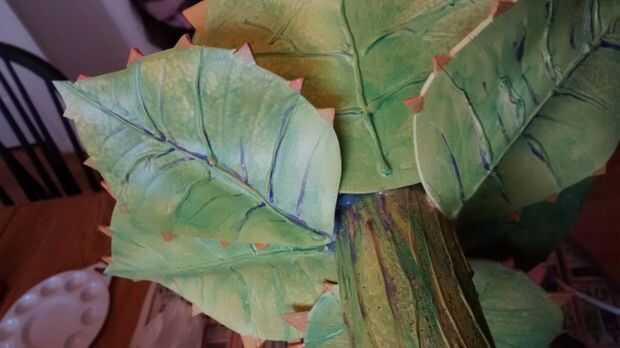 Organizar las hojas quieras alrededor de la cabeza. Empecé poniendo cuatro grandes dejar en primera, luego cuatro más pequeñas en las ventanas. Luego utilicé una pistola de pegamento caliente para extender el vástago de la hoja en la espiga de Audrey. Entonces tocó para arriba con la pintura para que luzca más natural.