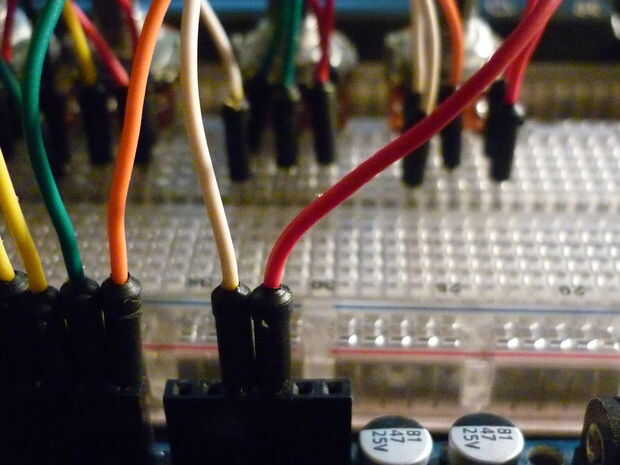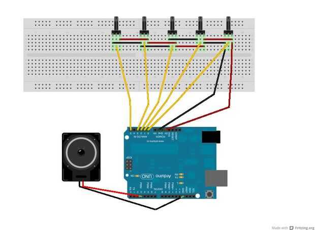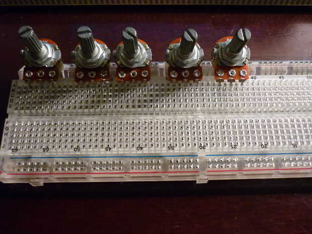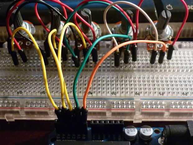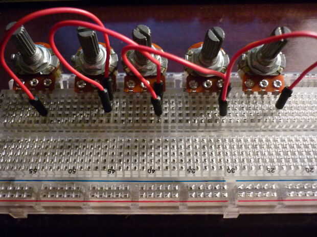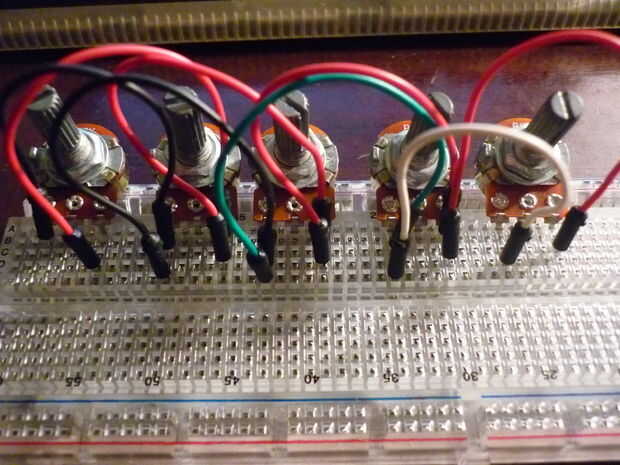 Básicamente todo cables positivos están conectados a 5V y negativos allí todos van a tierra. Y el plomo medio ollas va a un pin analógico en el arduino.