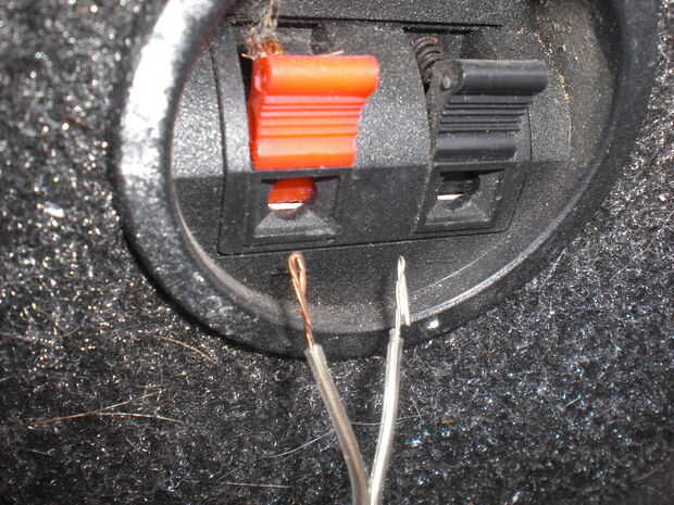 Para colocar los altavoces en la parte superior de la caja de herramientas, utilicé alambre de enfardar, pero pueden ser pegados o atornillados. El alambre de enfardar es acerca del mismo color que los altavoces y no destructivo. Utilicé cable de altavoz en las fotos, así que es fácil ver el cable.