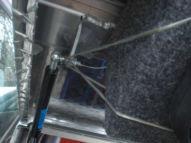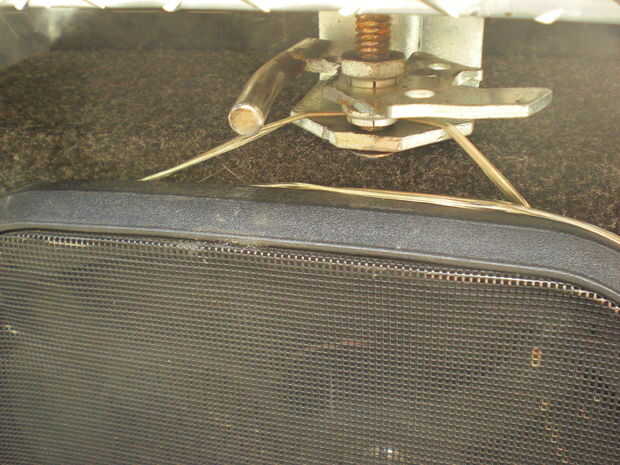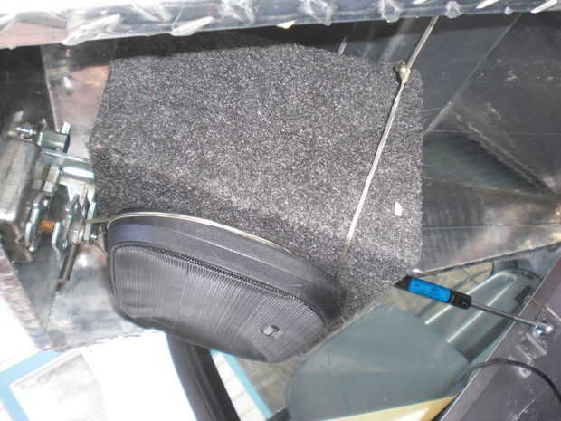 Empezar por encontrar 3 puntos que el alambre puede fijarse a. Mi caja de herramientas tiene un tubo que corre a lo largo de la tapa que fue fácil alimentar el alambre a través, entonces envuelto alrededor de la hebilla de bloqueo donde el pistón se fija a la tapa. Tomó algún trucaje, pero el altavoz puede ser asegurado. La cuarta foto muestra la ubicación de los altavoces finales.
