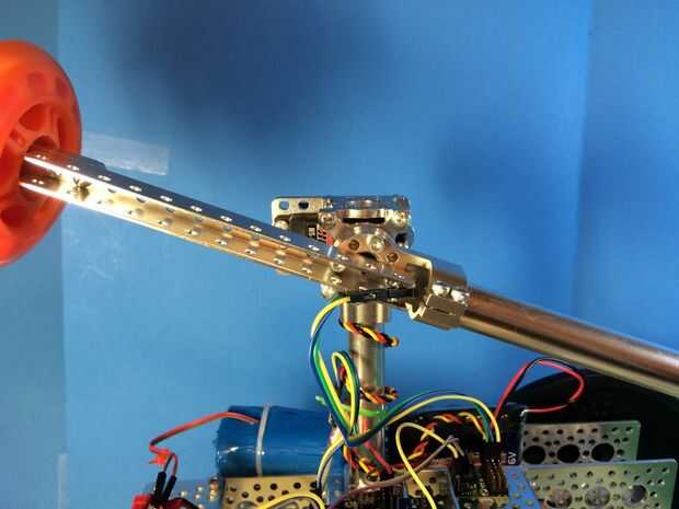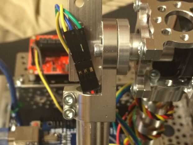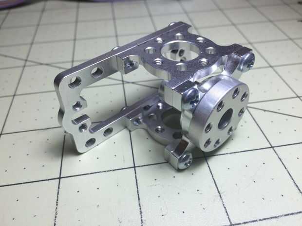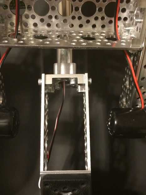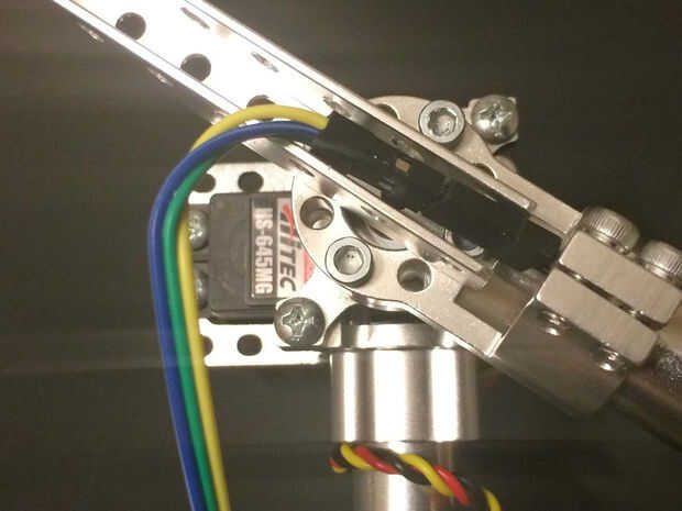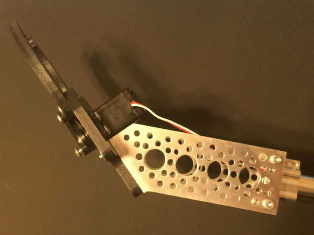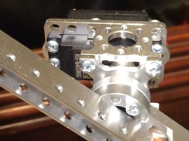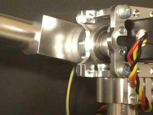 - Ahora toma el conjunto de tubo de 6" y coloque el extremo de la abrazadera 90deg en el eje del servo en el bloque de servo usando dos tornillos diagonalmente de uno a.