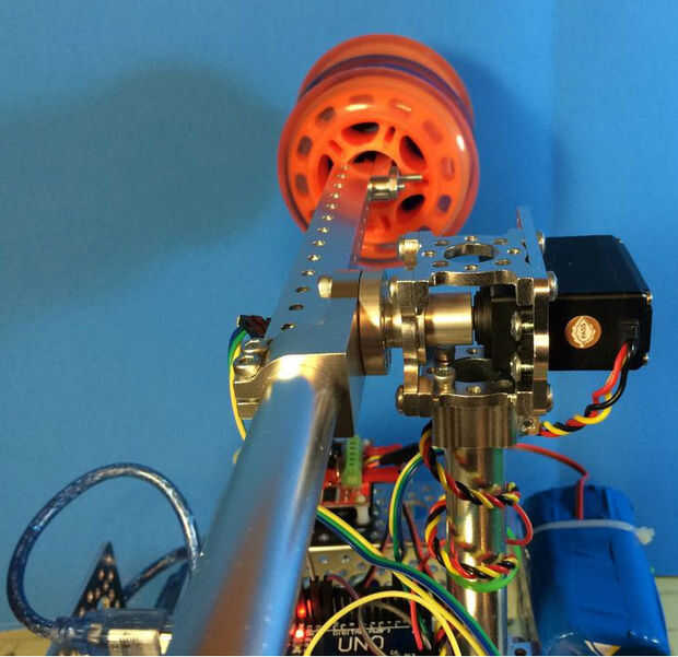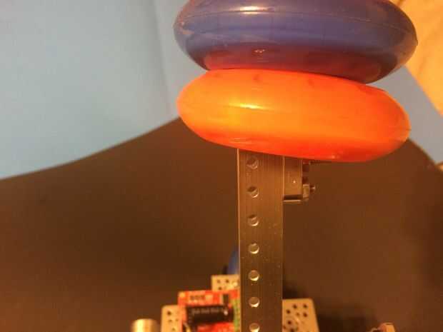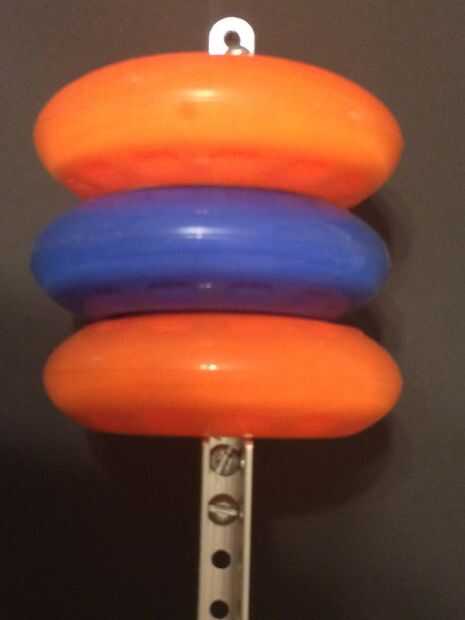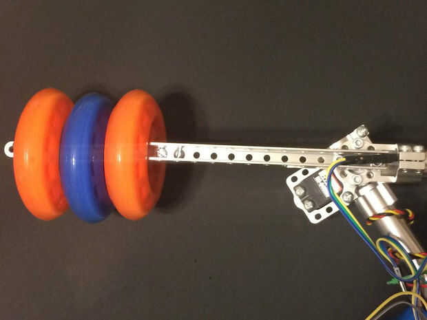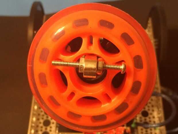 - Último, coloque los 3 ruedas de patín en el extremo de la pluma de un contrapeso. Utilice el tornillo de 1.5" para mantenerlos en el lugar con las dos tuercas como en la imagen.