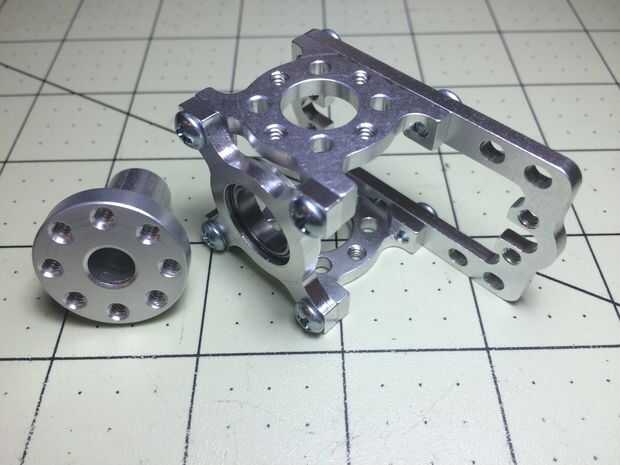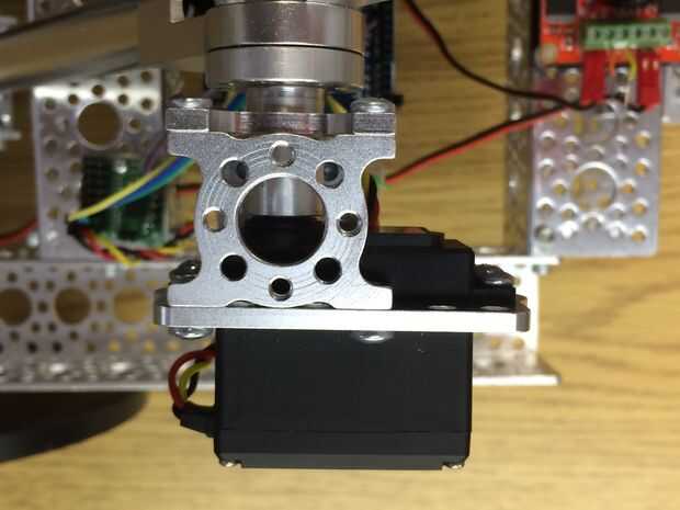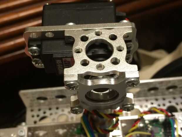 - Coloque el bloque de servos en la parte superior del eje de sujeción con el eje de moro hacia la derecha