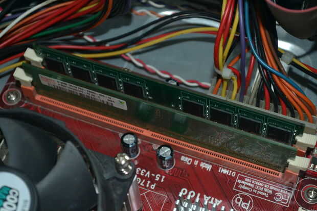 Ahora lo hay hacer es colocar la memoria Ram sabemos es compatibles con nuestra computadora en el enchufe tenemos disponible, para esto debemos asegurarnos de nuestra memoria Ram este bien colocada como se muestra en la imagen (la muesca tiene la Ram va con el palito esta en el medio del zócalo) y luego de esta bien posicionada se le hace presión hacia abajo hasta encaje bien como se muestra en la imagen. (los dos soportes laterales estén dentro de las muescas laterales de la Ram.