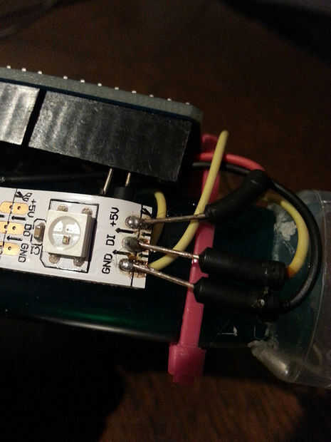 Si utilizas Neopixels por metro, corte un pedazo de ~ 7 píxeles y soldar los cables del puente como sigue: