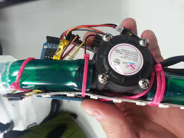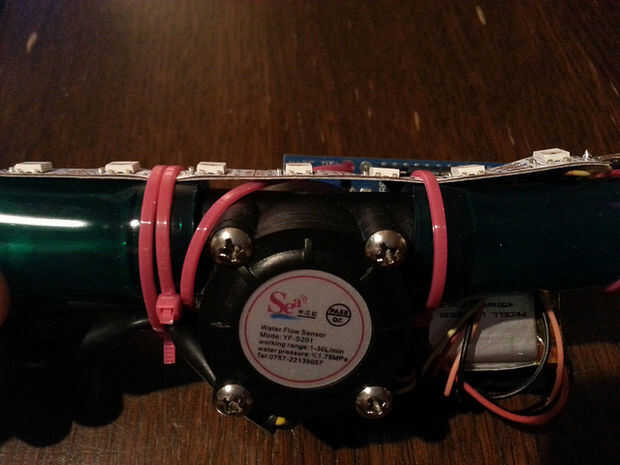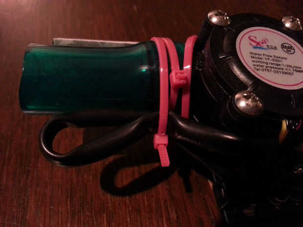 Colocar los dos tubos (verde) para el sensor de flujo, con el adaptador en la parte superior.