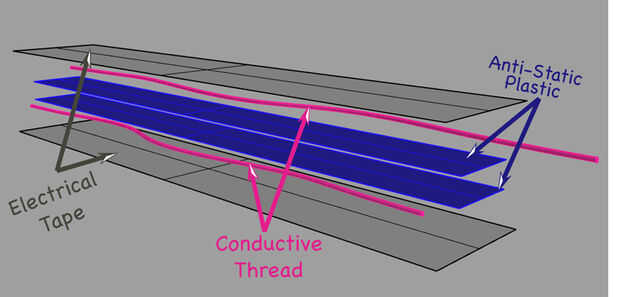 Básicamente sólo hacer un 'sandwich' de los materiales en este orden de abajo, y como cualquier buen sándwich, puede ser pedida a tamaño: cinta aislante (pegajoso hacia arriba), hilo conductor (sobresale en un extremo, pero no la otra), plástico antiestático (solo cubriendo el hilo en los bordes de la cinta, no demasiado amplio). Ahora piensa en la cinta aislante como la mitad de un bollo. Hacer la otra mitad del 'moño' del mismo modo con una excepción: el hilo conductor debe ahora sobresalen la dirección opuesta. Asegúrese de que la lechuga antiestático comprende todo el hilo de rosca dentro de los bordes de la cinta, pero no toda la anchura de la cinta.