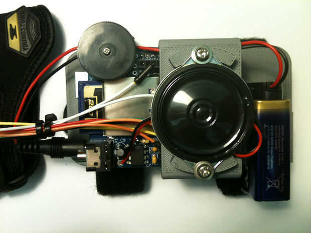 (También se ejecuta en una batería de 9v y tiene un altavoz soldado en el protector de la onda!) La genialidad es un soporte personalizado, diseñado en un software CAD y utilizando una impresora 3D . No era mencionado anteriormente ya que es un poco de un lujo tener una impresora 3D.