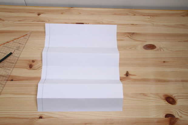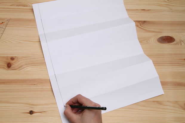 Dobla el papel por la mitad tres veces. Continuar lo desarrollando y marcando 4 agujeros a partir de la tapa superior y luego saltando uno doblan para cada conjunto, así que la distancia entre los orificios hacia la parte superior y borde inferior es más pequeño que la distancia entre los agujeros.