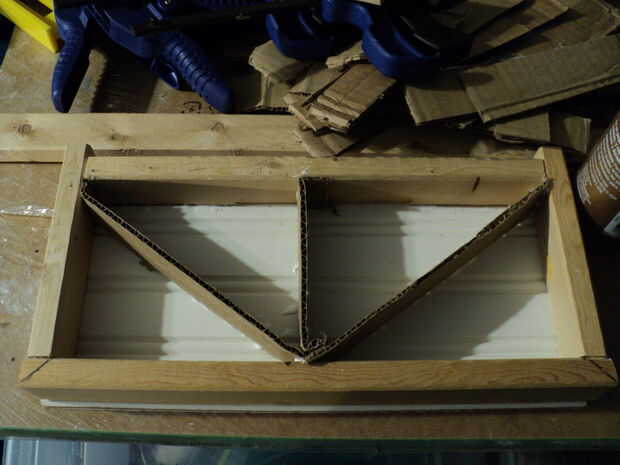 Tomar algo duro pulir los bordes de las piezas de cartón para que quede nivelado con la altura de la llanta de madera alrededor de la pieza. Esto es necesario para asegurar que el panel de la cara superior se le pegado abajo de plano y en contacto con toda la estructura interna.