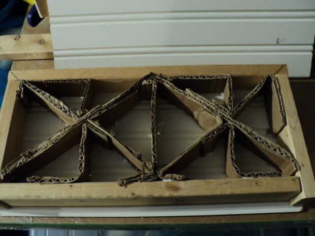 Esencialmente usted quiere una matriz de nido de abeja para rellenar el interior de la pieza. No hay necesidad de llenar totalmente con cartulina.