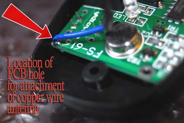 Mirar hacia el borde izquierdo del tablero FS-616 (cerca lejos ' 6') y usted encontrará un plateado a través del orificio en el extremo de la antena de PCB. Es en este agujero que colocaremos el extremo pelado del alambre de cobre.