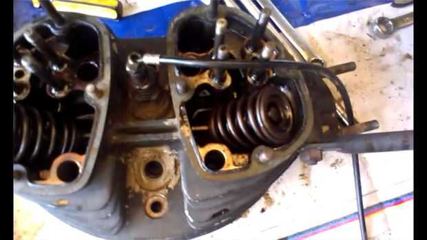Siguiente paso es quitar la cabeza del motor y carburador. Al quitar el carburador, sacar los cables del filtro también. Quite las dos tuercas a cada lado del carburador, y ahora puede simplemente quitar el carburador y sus juntas y mecanismo de tornillo de aire auxiliar. Coloque los componentes quitados en una manera limpia y ordenada.