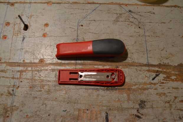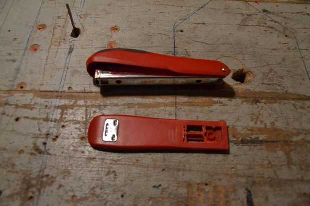 Corte la grapadora en 2 y archivo con la Sierra de metal, también de arriba y abajo para asegurarse de que el epoxi pega mejor.