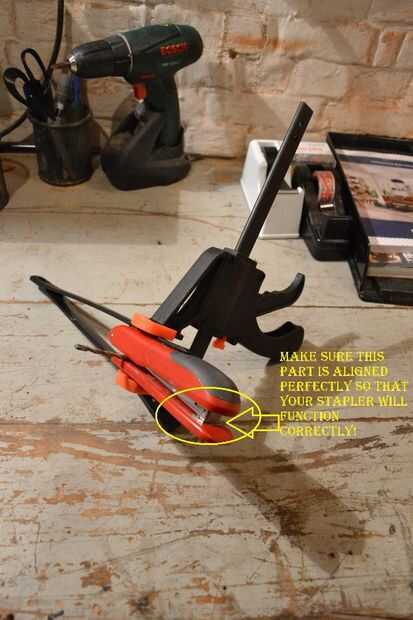 Opcional pero importante: necesita alinear el doblador de grapas (la pieza de metal en la parte inferior de la grapadora) a la parte superior donde las grapas vienen de modo que cuando usted les de la grapa, cierran correctamente... Si no se alinean correctamente, usted terminará con una grapadora torcida :D.