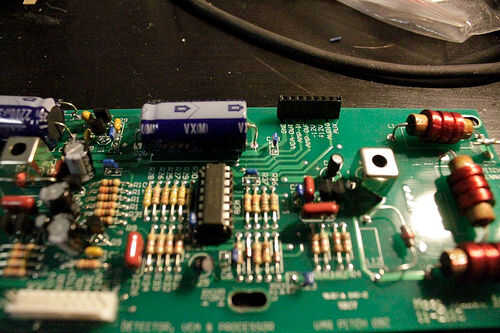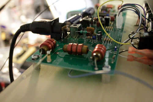 Para obtener la soldadura a esta clavija, retire la Junta del theremin y dale la vuelta. Adjunto es una foto de exactamente qué pines para soldar a. Ejecute el cable debajo de la tabla hacia el lado izquierdo.