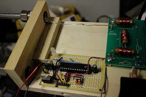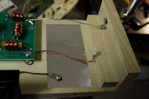 Usé un * lenguado * de pegamento caliente para fijar el otro LED, en el extremo derecho del theremin.