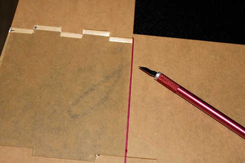 Decidí que quería que ambos lados ser translúcido, no transparente (donde están los LEDs). Trazó una línea en ambos lados y con un exacto corte el papel a lo largo de esta línea. Luego tomar el papel y con una lija de grano fino (papel de lija) van en el interior del acrílico.