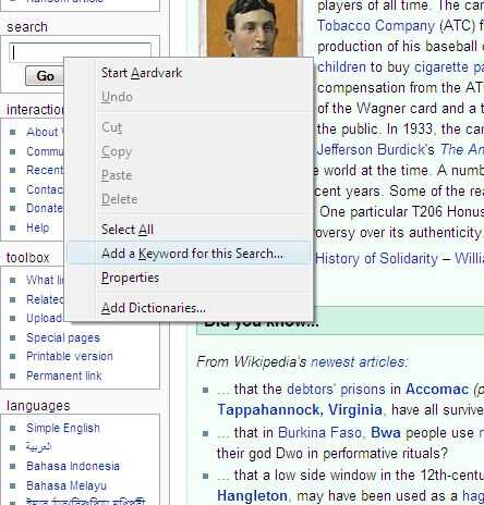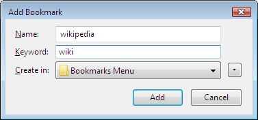 Para ello, haga clic derecho sobre el campo que desea agregar la palabra clave y haga clic en "Añadir una palabra clave para esta búsqueda". Introduzca el nombre de la página (no masivo importante pero ayuda a mantener tus favoritos organizados) e introduzca la palabra clave para la búsqueda, en mi caso, "wiki".