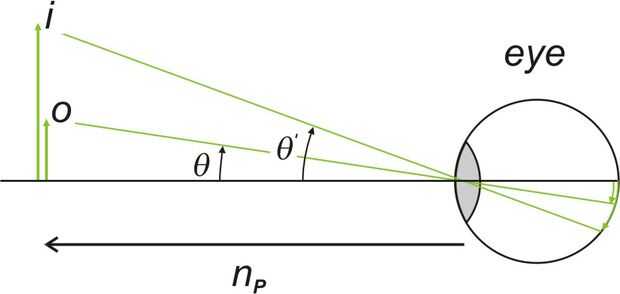 o representa el objeto en el dibujo, en este caso las divisiones en una regla de acero y la imagen virtual ampliada del calibrador a vernier escala de división como producida por el microscopio. Debe ser la misma distancia del ojo, generalmente en el punto cercano. Esto fue hecho por comprobar que hay no hay paralaje entre ellas - http://www.lhup.edu/~dsimanek/scenario/labman3/thinlens.htm