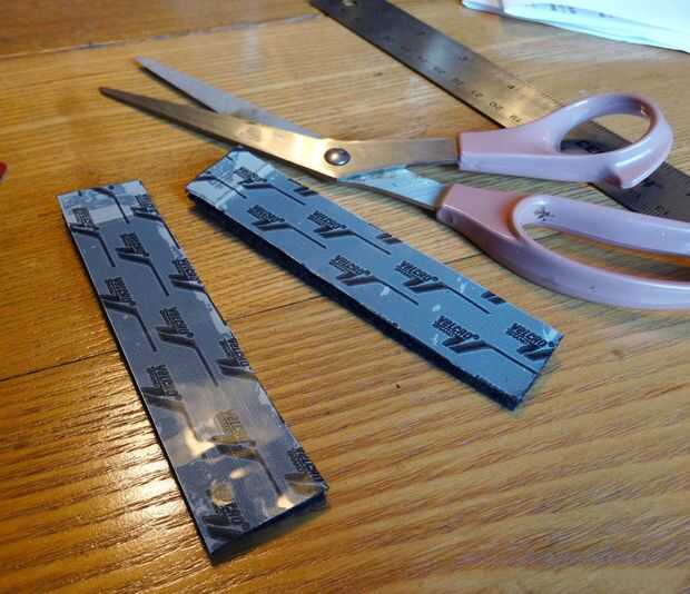 Utilizar la plantilla de aleta de puerta para marcar y cortar piezas de velcro para cada lado y el borde inferior. Puesto que mi velcro era muy amplia, he podido dividir mis cortes por la mitad para obtener piezas más.