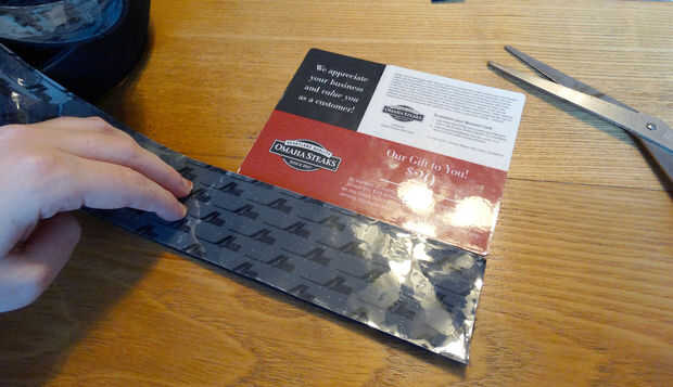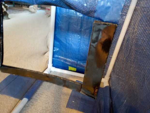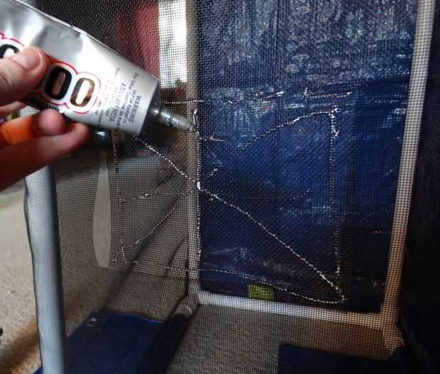 Siguiente, aplicar E-6000 o Loc-Tite en el exterior de la pantalla doorflaps. Golpear todos los bordes y hacer líneas diagonales a través del centro para obtener buena cobertura.