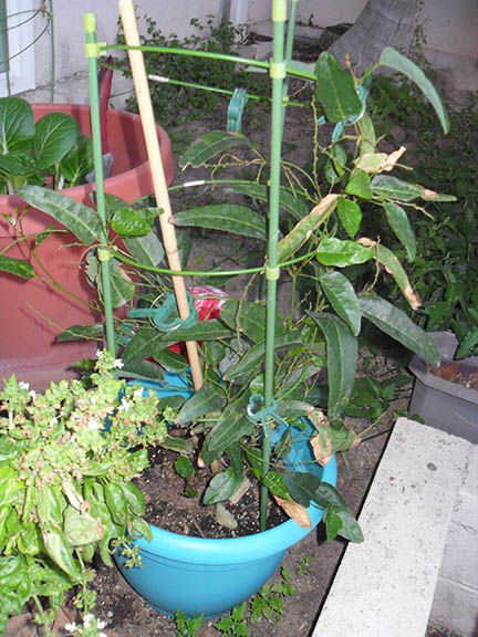Ya que ahora vivo en Los Angeles urbano y no se encuentran tan fácilmente las plantas hospederas de Cecropia, me decidí a comprar una planta con suficiente antelación para darle tiempo a crecer antes de cualquier orugas necesitaría it Compré una escalada especies de Lila que entrenó a una jaula de varilla o de tomate, hará una bonita planta verticalmente con formato para caber dentro de la casa de la polilla.