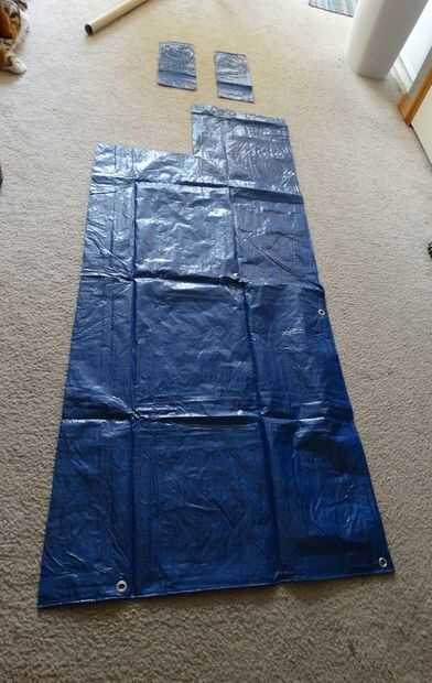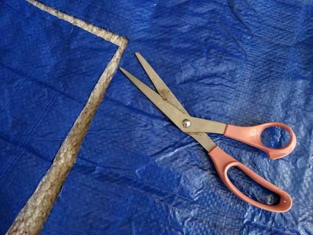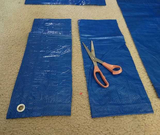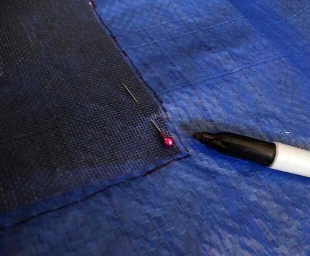 Utilice tijeras para cortar a lo largo de las líneas de Sharpie en la lona. DEJA el pedazo de techo atado al trazo de la lona más grande. Quiero acabar con algo que se parece a la foto 7.