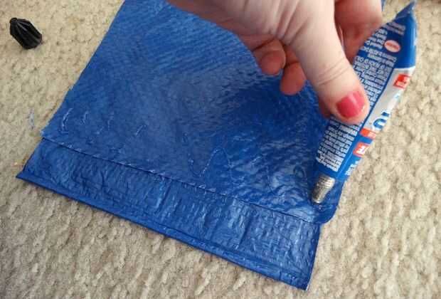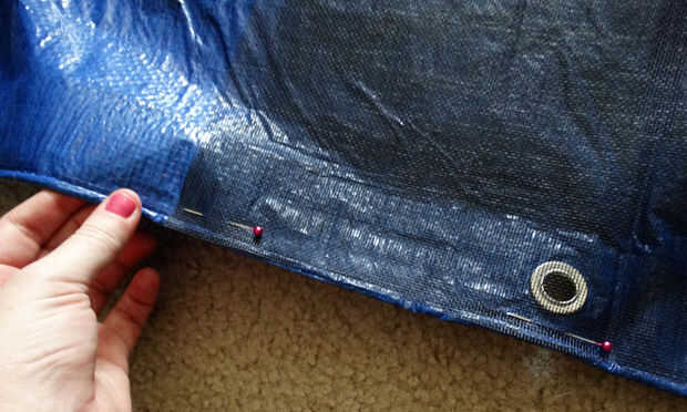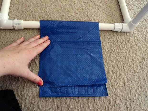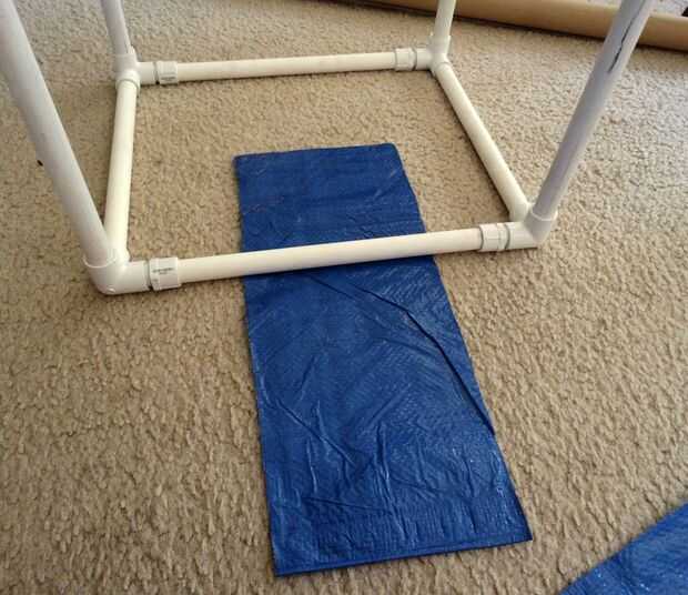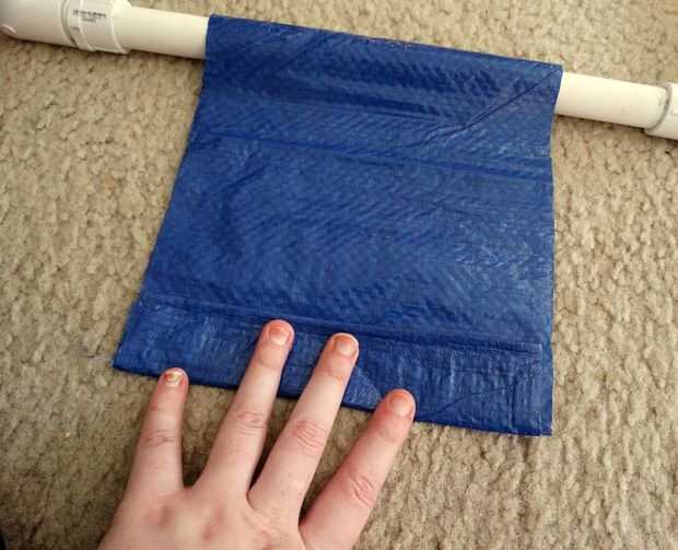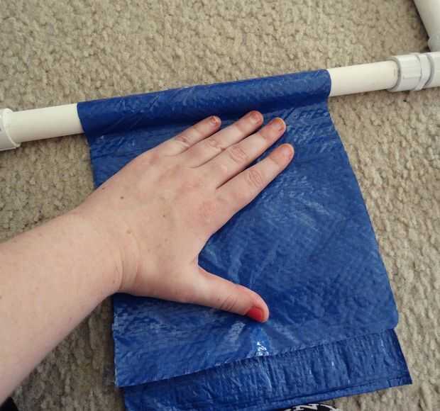 Doblez hacia arriba y sobre el PVC hasta cumplir con los 2 extremos. Esta será la longitud final de la ficha de anclaje si no sientes esto es suficiente espacio para colocar un peso adecuado en, cortar un pedazo más largo de la lona de su desecho e inténtelo de nuevo.