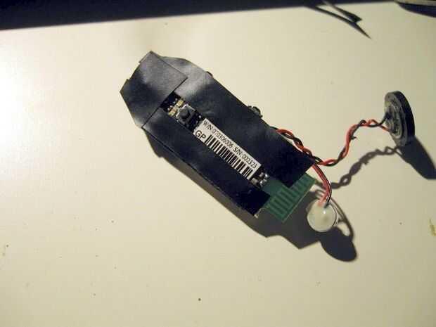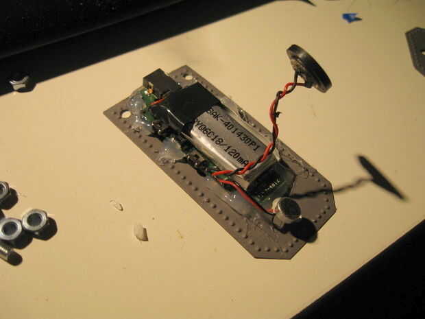 Luego que acoplar la placa de circuito para que el botón de respuesta correspondería con el agujero de la etiqueta del metal y aplica una cantidad razonable de pegamento.