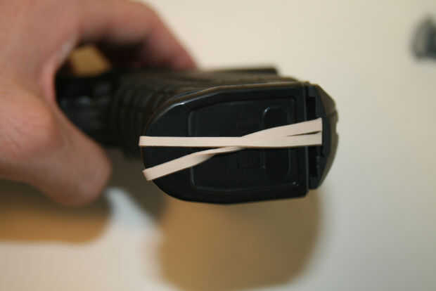 La cantonera revista vuelva a colocar la empuñadura y estirar la goma de la parte delantera de la placa de tope en la parte inferior y fíjela a la parte posterior de la empuñadura poniendo bajo el resto de la palma. Poner el pin de resto de Palma en lugar para asegurarse de que se queda.