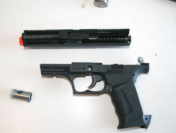 Retire el conjunto del fiador en la parte trasera de la pistola, tiro hacia fuera.