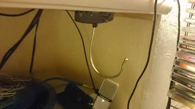 Sin embargo, sería necesario tener el cable colgando hacia abajo y conseguir el modo (totalmente sin mencionar que yo soy demasiado perezoso para levantarse conseguirlos). Así que la otra opción sería tener el gancho debajo de mi escritorio. En mi escritorio tengo un labio colgante que serviría como el lugar para el gancho.