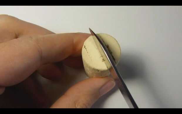 Con un cuchillo hacer un corte pequeño en ambas tapas de corcho y un tro de uno en un ángulo para sacar un pequeño trozo de material.