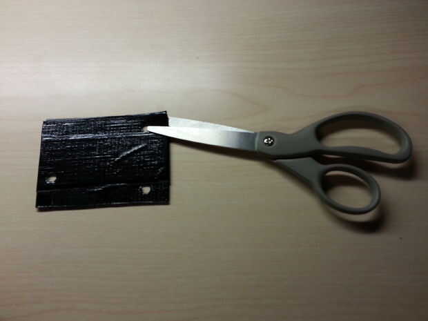 Con tus tijeras, con cuidado corte una pequeña ranura desde el borde corto de la tarjeta al centro de cada agujero. Sin embargo, no corte el agujero fuera del centro.