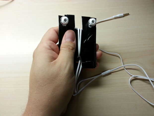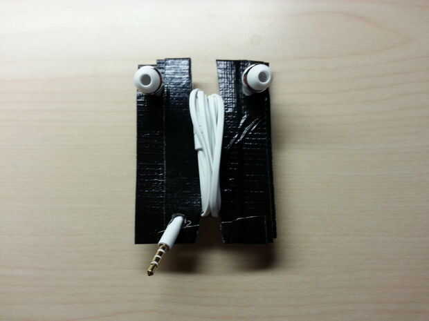 3. una vez que el cable está cerca de ser completamente herida, inserte al jack de auricular en el orificio de compensación en la parte inferior de la tarjeta.