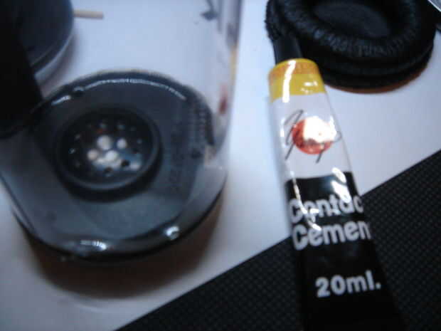 Pegar el medio cilindro con los auriculares, he usado cemento de contacto pero puedes usar lo que quieras.