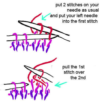Al llegar al final de la cuerda puede deshacerse comenzando una nueva fila como de costumbre para hacer 2 puntos de sutura. Tire la primer puntada sobre el segundo, añadir un punto nuevo y tirar la segunda puntada sobre el tercero y así sucesivamente... hasta terminar la fila. Tejido de cualquier hilo suelto en el punto.